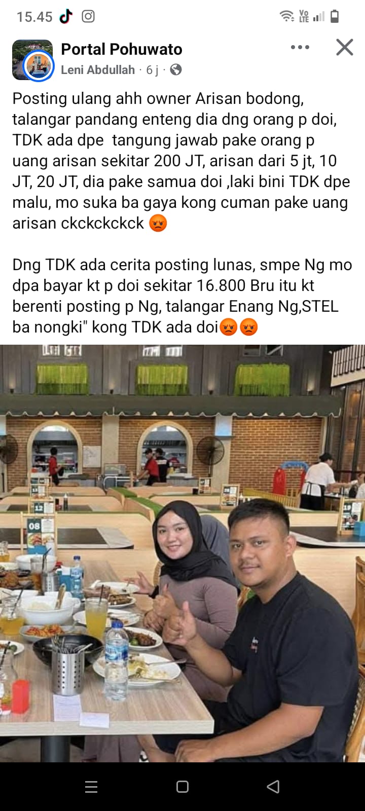 Dalam unggahan 6 hari lalu, Leni menuding owner arisan membawa lari dana sekitar Rp200 juta dan menyebut “laki bini TDK Depe malu”. Unggahan itu disertai foto Sultan Pakaya bersama istrinya.