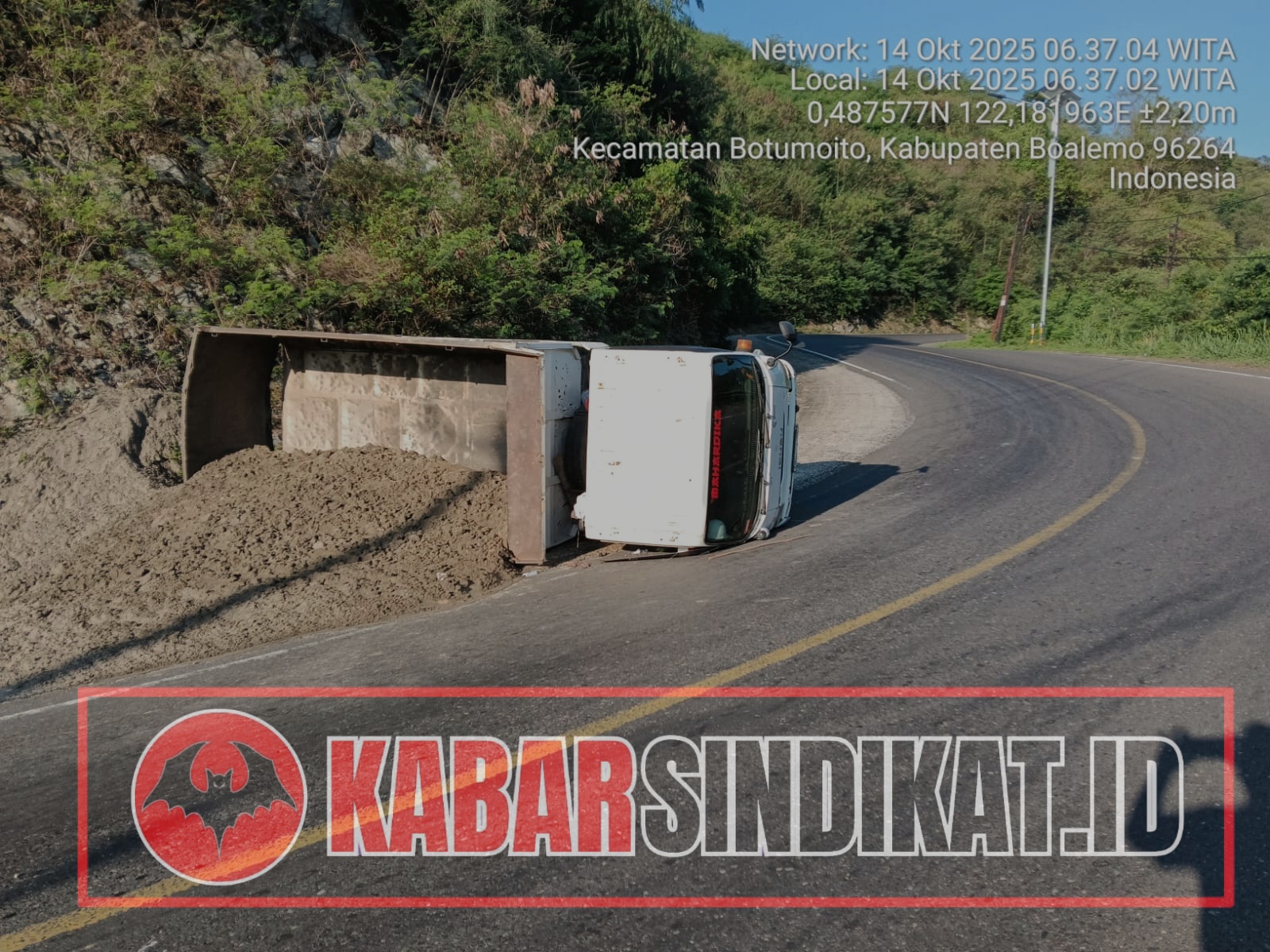 Gorontalo-(kabarsindikat.id) Kecelakaan satu unit kendaraan roda empat jenis Dump Truk terjadi di ruas jalan Trans Sulawesi kecamatan Botumoito,kabupaten Boalemo pada pukul 05.00 wita pagi tadi menggegerkan pengendara.